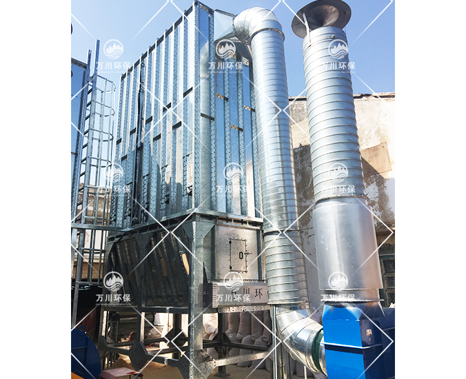 木屑吸入至風(fēng)管,以負(fù)壓的形式進(jìn)入到脈沖布袋除塵器。含塵廢氣進(jìn)入中箱體下部,在擋風(fēng)板形成預(yù)分離室內(nèi),粉塵因慣性作用落入灰斗。